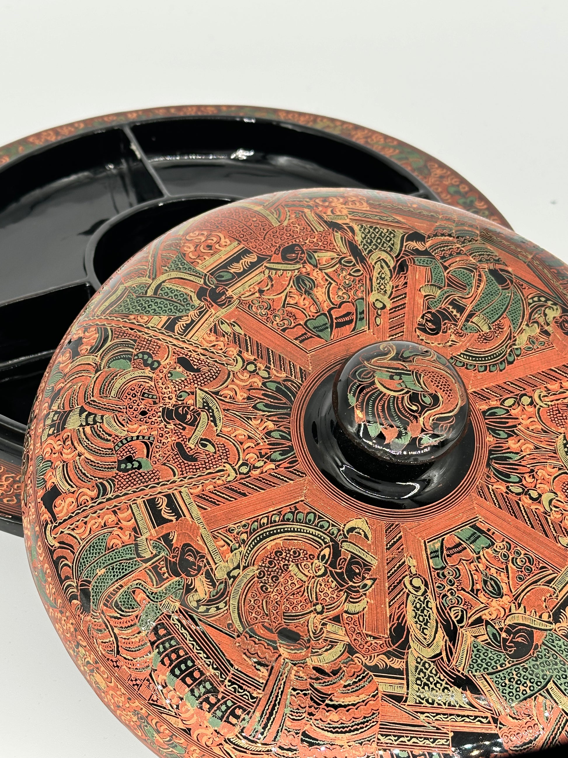 Laphet set for tea leaf salad, candies, desserts and confections. Genuine, handcrafted Burmese Lacquerware. Made of bamboo and tree resin.